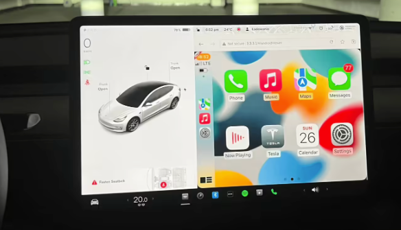 与传统车企让CarPlay接管全屏的模式不同,特斯拉的方案明确了系统分工:中控屏幕左侧三分之一区域及底部导航栏由特斯拉原生系统控制,持续显示车速、电量、空调状态及Autopilot/FSD(完全自动驾驶)等核心驾驶信息。