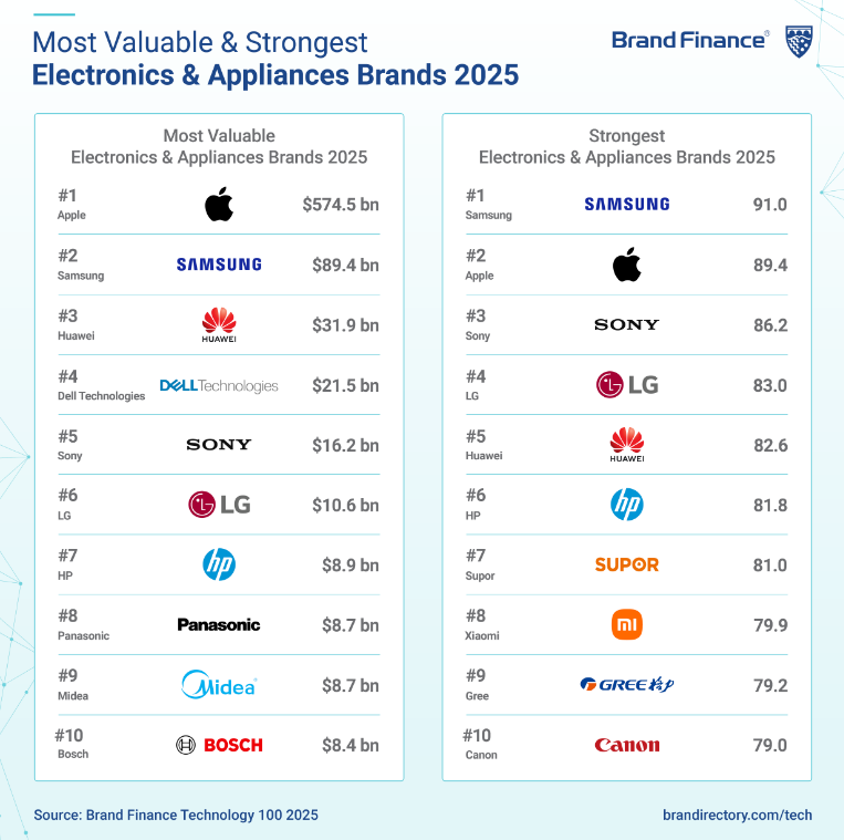 Brand Finance 还公布了其中的互联网和软件品牌榜单(微软、甲骨文、SAP 前三)、电子电器品牌榜单(苹果、三星、华为前三)。