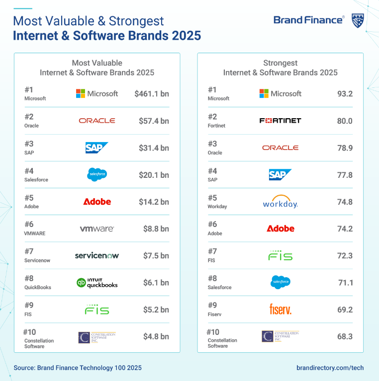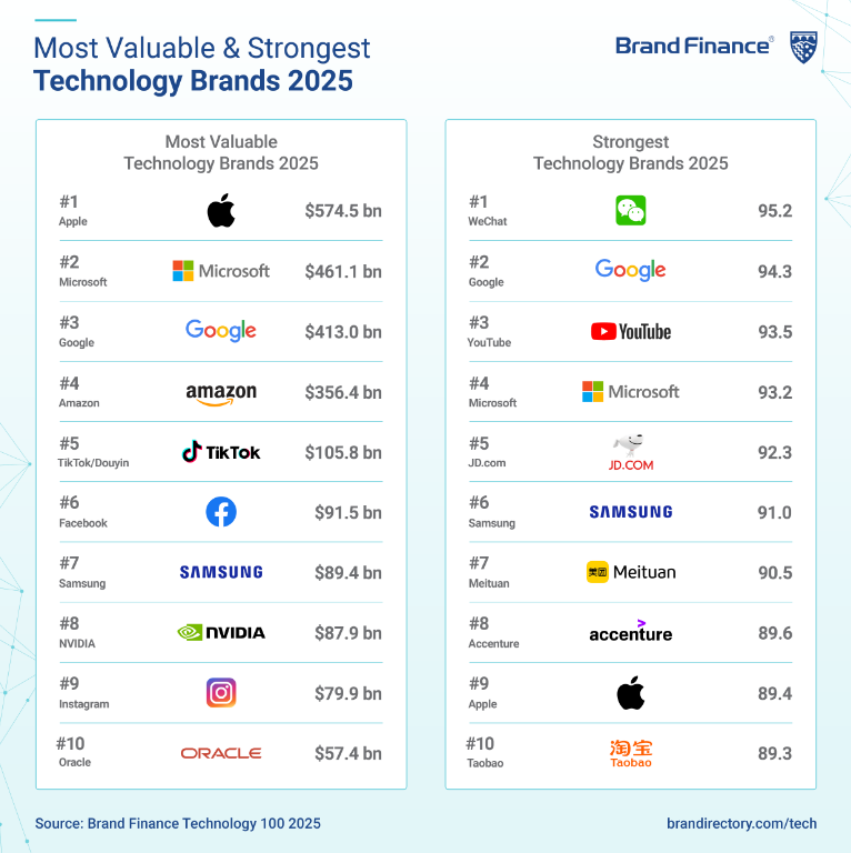 微软、谷歌、亚马逊和 TikTok / 抖音在 2025 年保持了 2024 年的排名,分别位列品牌价值第二至第五位。