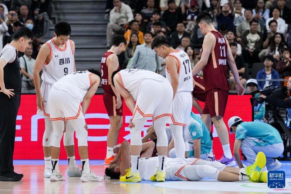 11月11日,四川队球员周琦(下)在比赛中受伤倒地。新华社记者 李博 摄