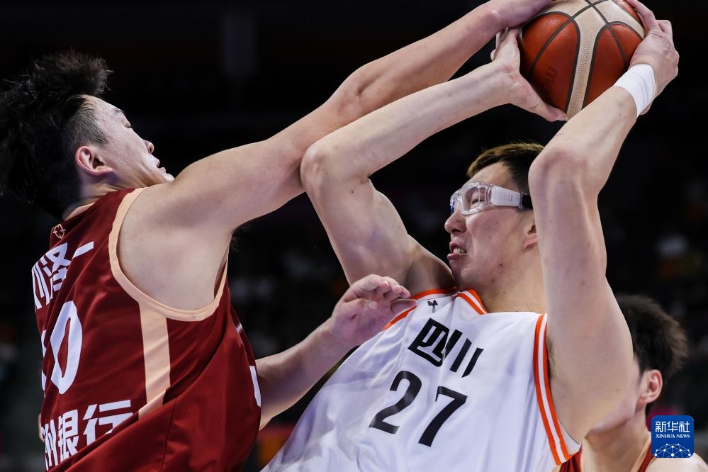 11月11日,四川队球员周琦(右)在比赛中拼抢。新华社记者 李博 摄